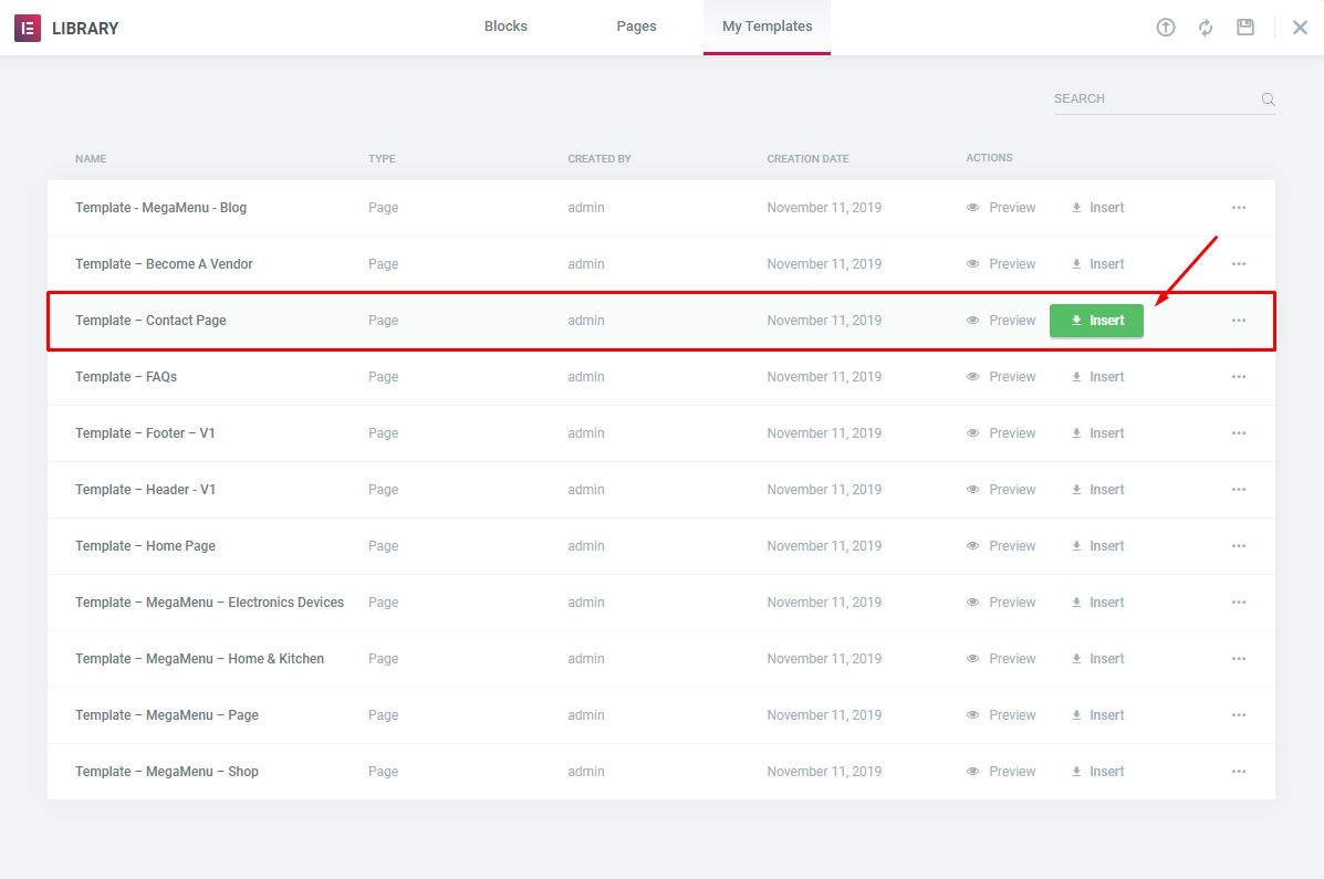 Step 4 - Click on the My Templates > Teamplate - Contact Page > Insert.