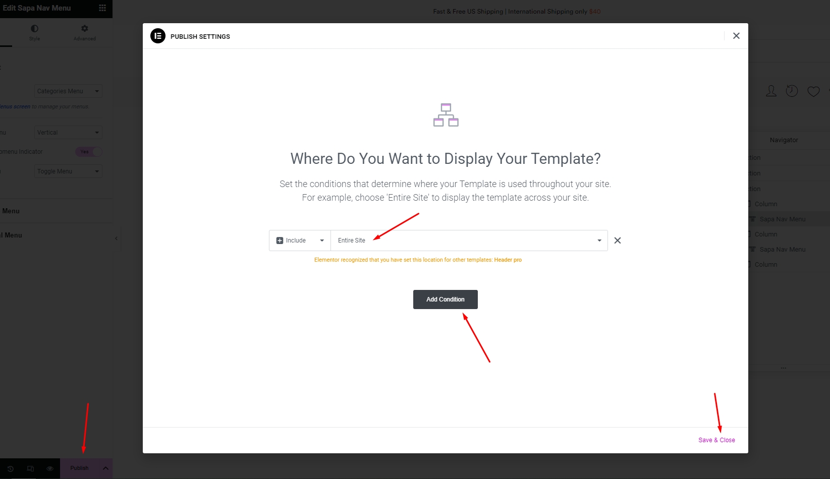 Step 4 - Publish -> Add Condition = Entire Site -> Save