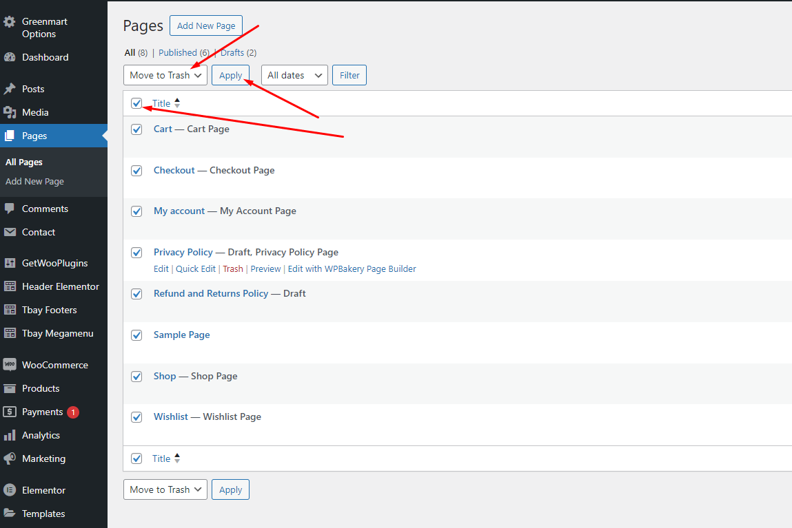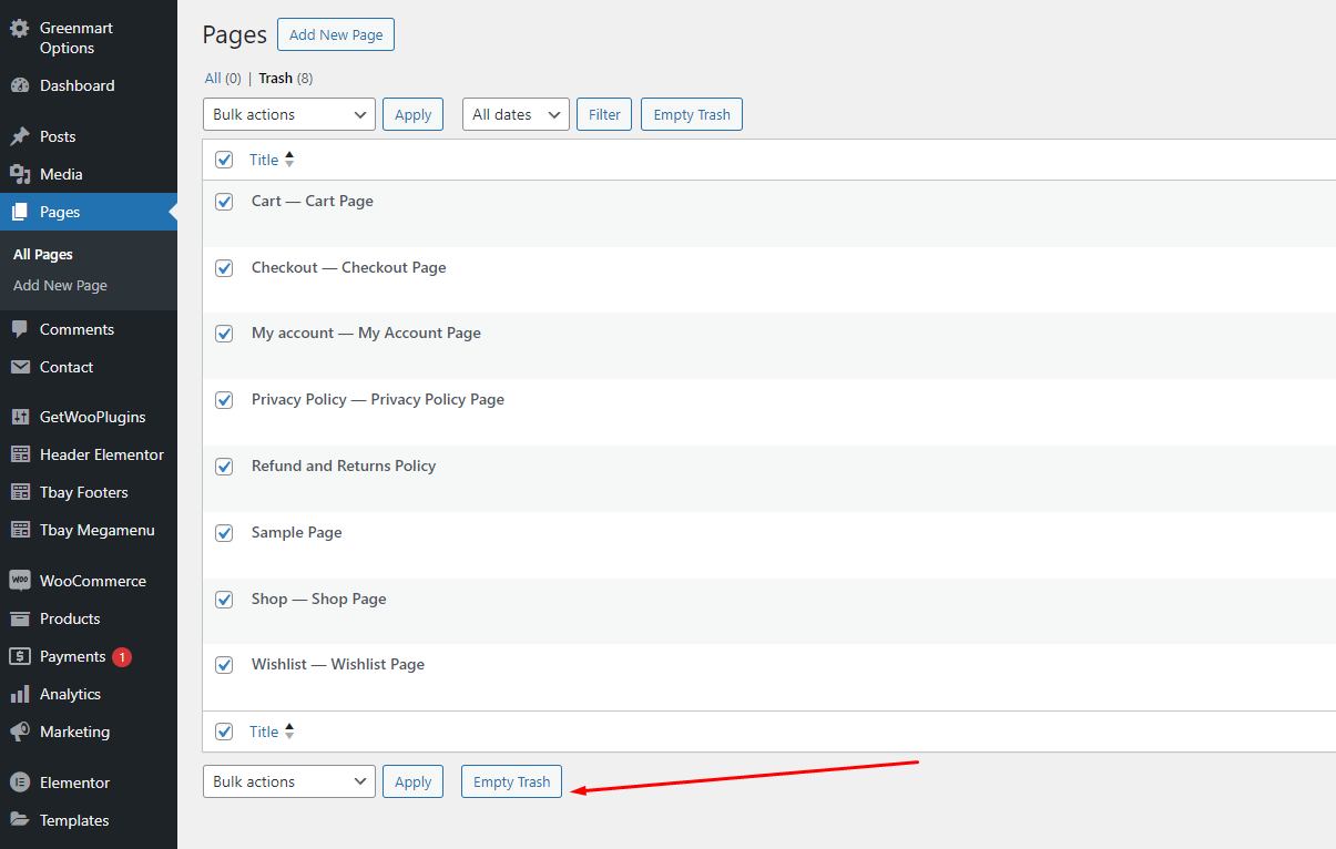 {% hint style="warning" %} <mark style="color:red;">**First, delete the default pages that the WooCommerce plugin created**</mark>