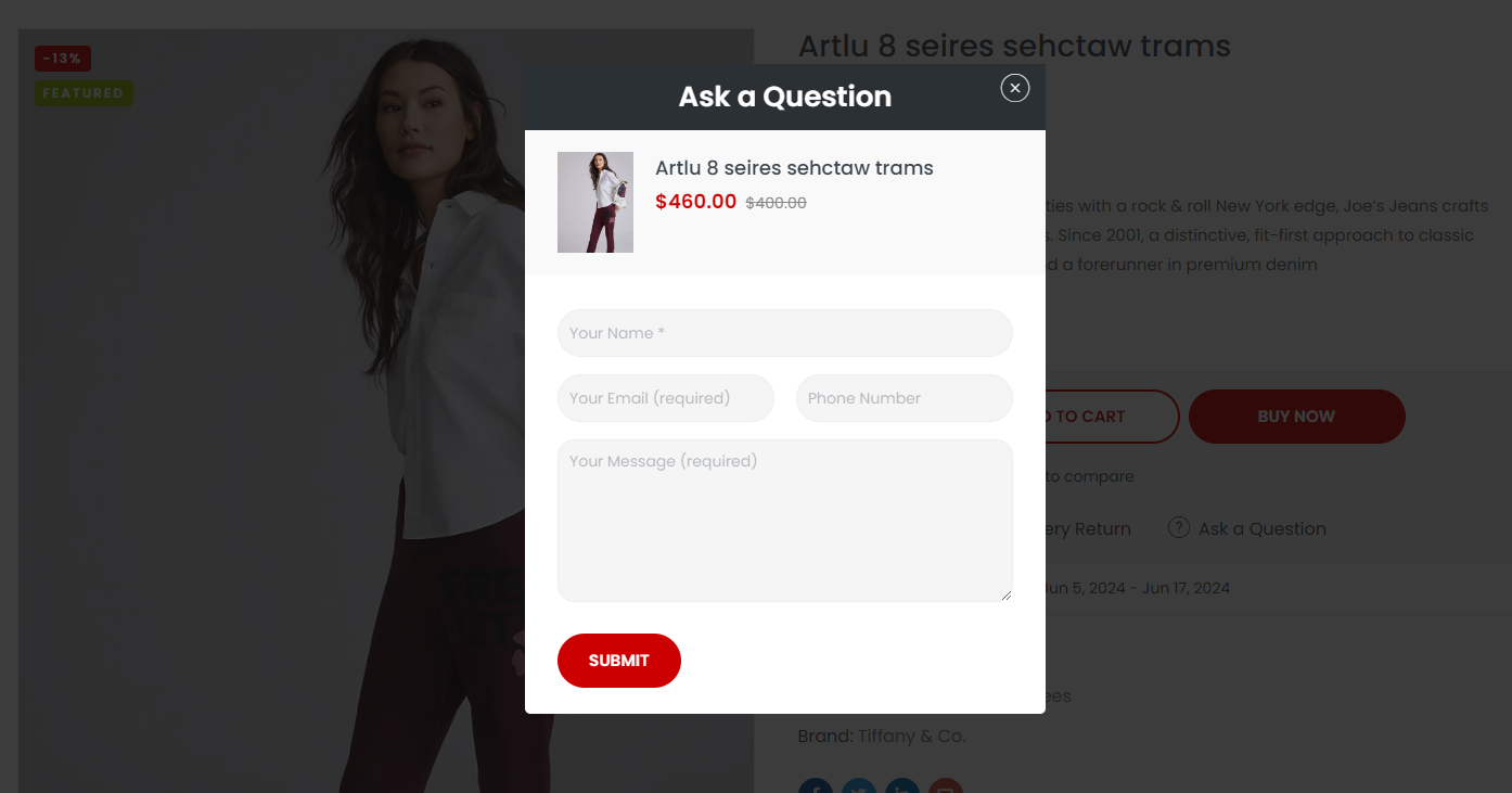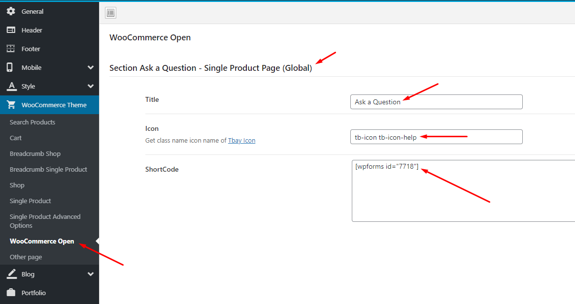 **Step 2: Copy Shortcode and paste in Theme Options: Vova Options > Woocommerce Theme > WooCommerce Open > Ask a Question - Single Product Page (Global)**