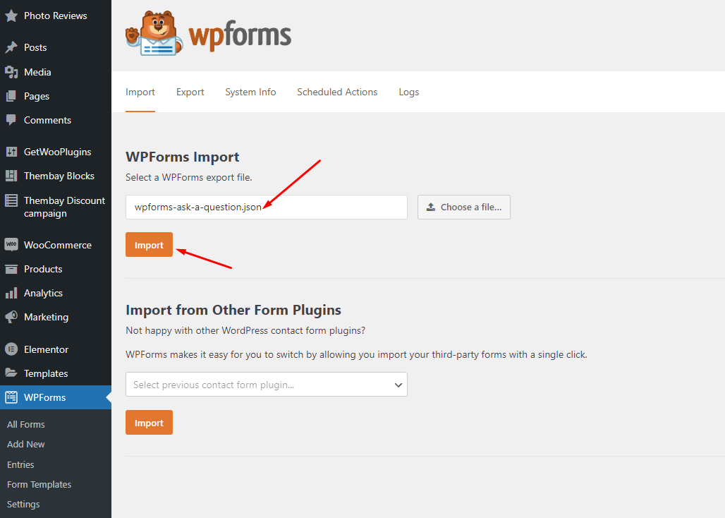 **WPForms => Tools =>WPForms Import => Choose a file**